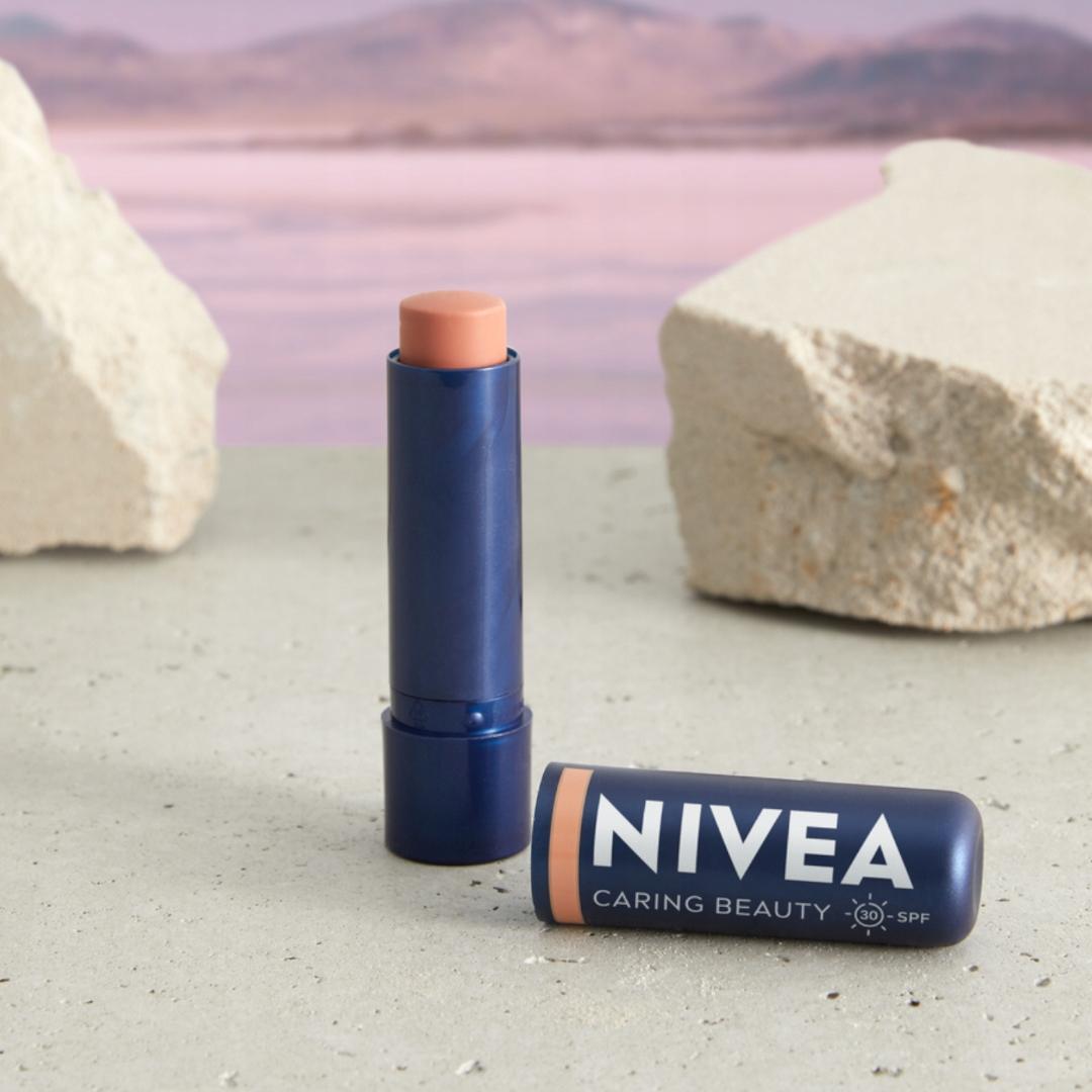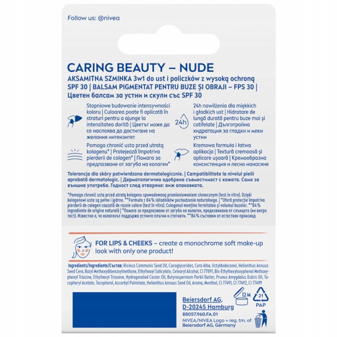 Pielęgnująca szminka Caring Beauty z formułą 3w1: stopniowo buduje intensywność koloru na ustach, pozostawia usta gładkie i nawilżone przez 24 h oraz pomaga chronić skórę ust przed utratą kolagenu, dzięki ochronie przeciwsłonecznej SPF 30. Pomadka przeznaczona jest do stosowania nie tylko na usta, ale i policzki. Jej kremowa formuła sprawia, że pomadka jest lekka w aplikacji. Produkt jest wzbogacony o witaminą E oraz organiczny olej migdałowy. Pro Tip: Pomadki z linii Caring Beauty można łączyć ze sobą i nakładać warstwowo, aby uzyskać dodatkowe, unikalne odcienie. Tolerancja dla skóry potwierdzona dermatologicznie. Wyjątkowa pielęgnacja od NIVEA oparta na ponad 100 latach doświadczenia w pielęgnacji skóry