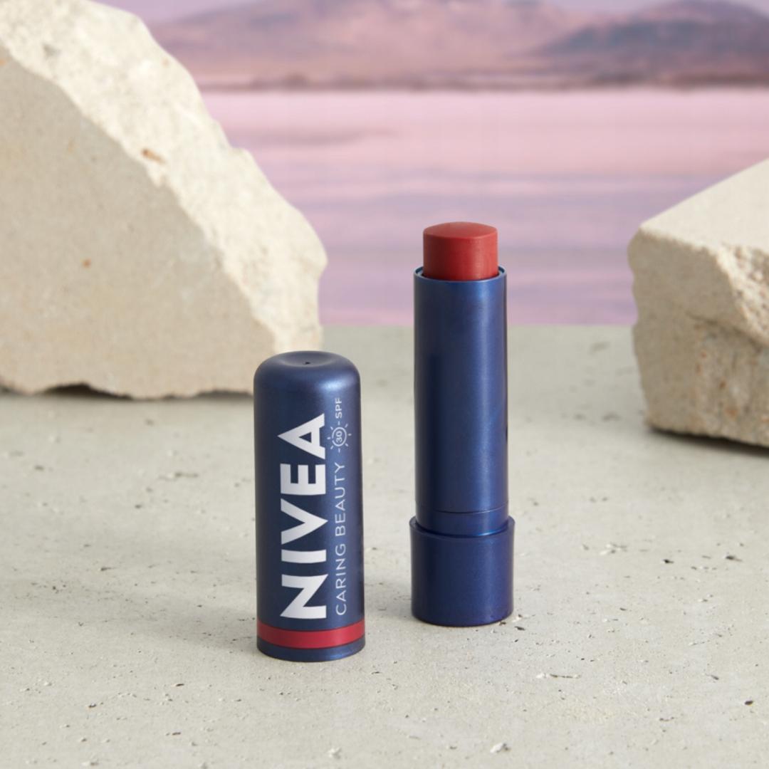 Pielęgnująca szminka Caring Beauty z formułą 3w1: stopniowo buduje intensywność koloru na ustach, pozostawia usta gładkie i nawilżone przez 24 h oraz pomaga chronić skórę ust przed utratą kolagenu, dzięki ochronie przeciwsłonecznej SPF 30. Pomadka przeznaczona jest do stosowania nie tylko na usta, ale i policzki. Jej kremowa formuła sprawia, że pomadka jest lekka w aplikacji. Produkt jest wzbogacony o witaminą E oraz organiczny olej migdałowy. Pro Tip: Pomadki z linii Caring Beauty można łączyć ze sobą i nakładać warstwowo, aby uzyskać dodatkowe, unikalne odcienie. Tolerancja dla skóry potwierdzona dermatologicznie. Wyjątkowa pielęgnacja od NIVEA oparta na ponad 100 latach doświadczenia w pielęgnacji skóry.