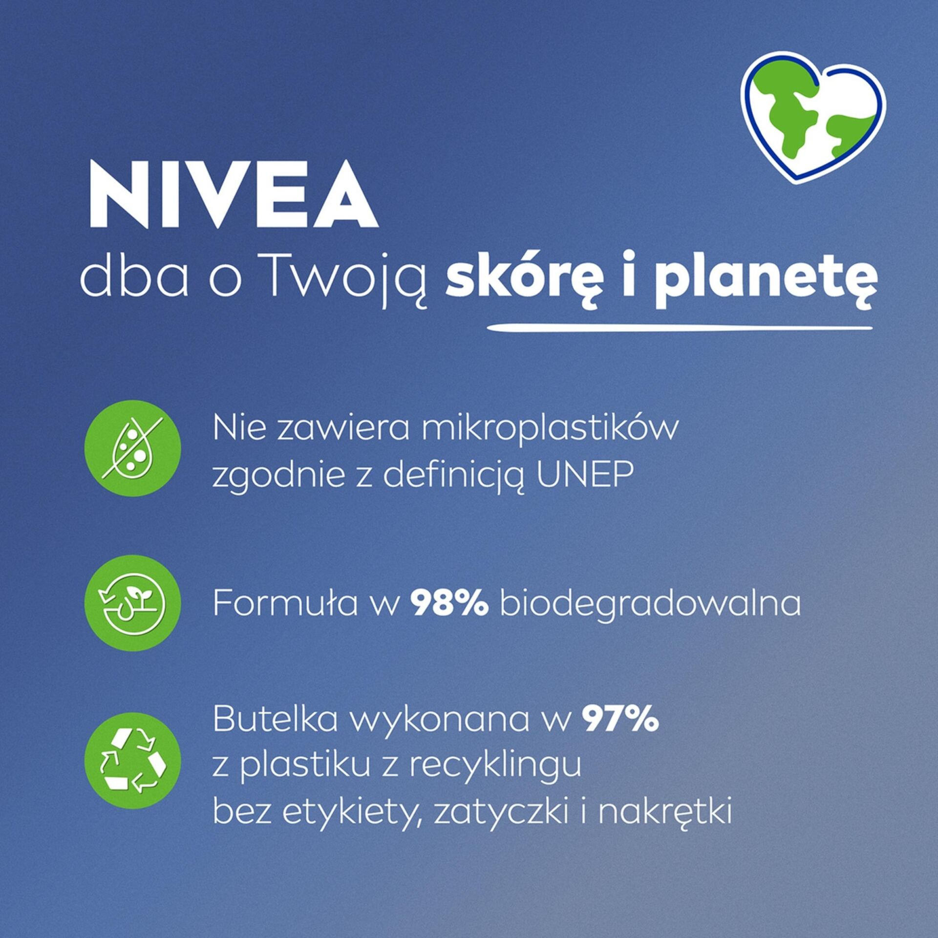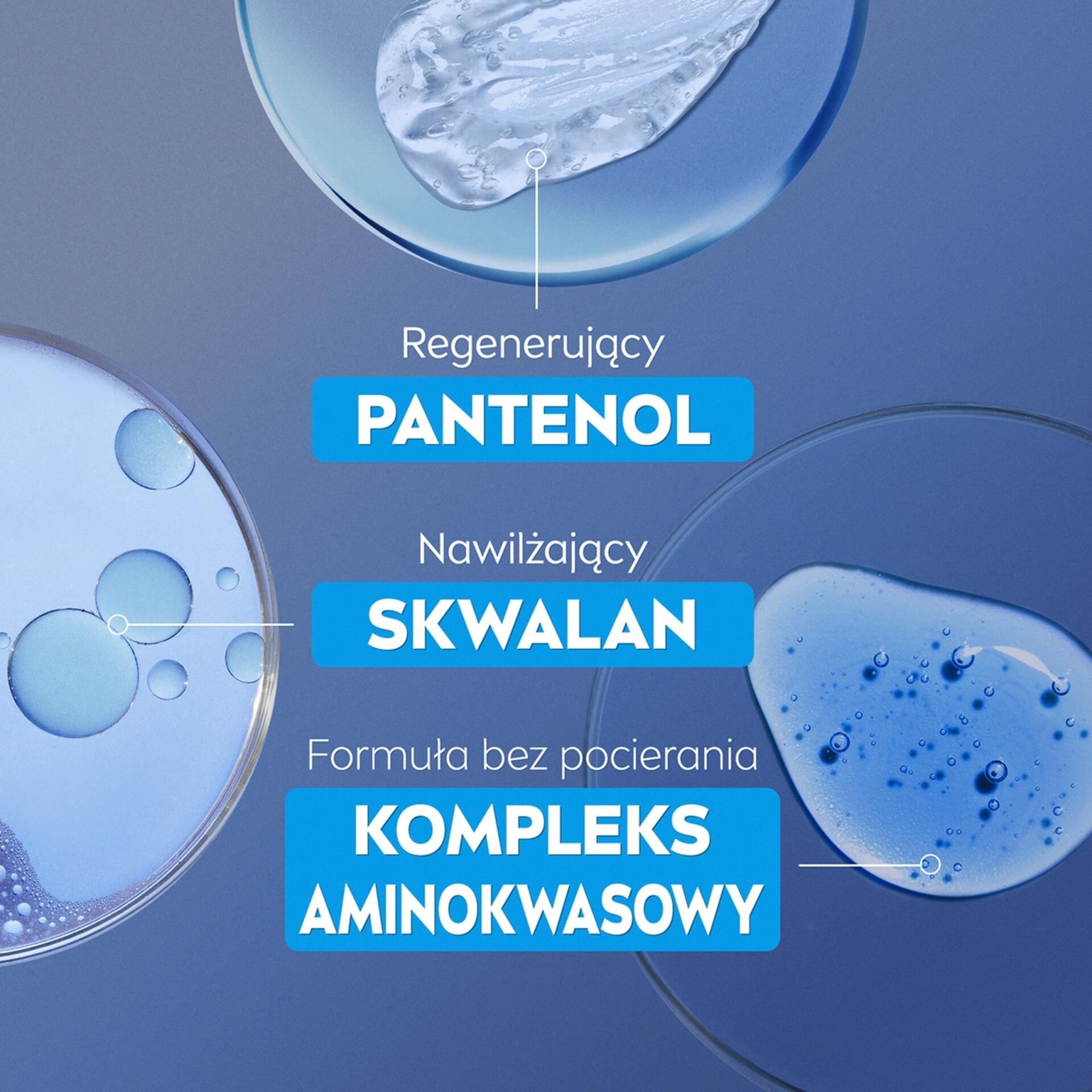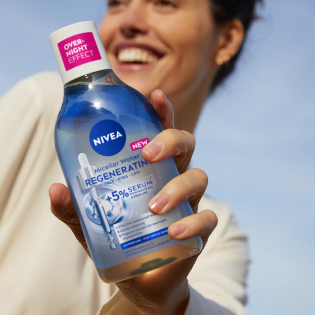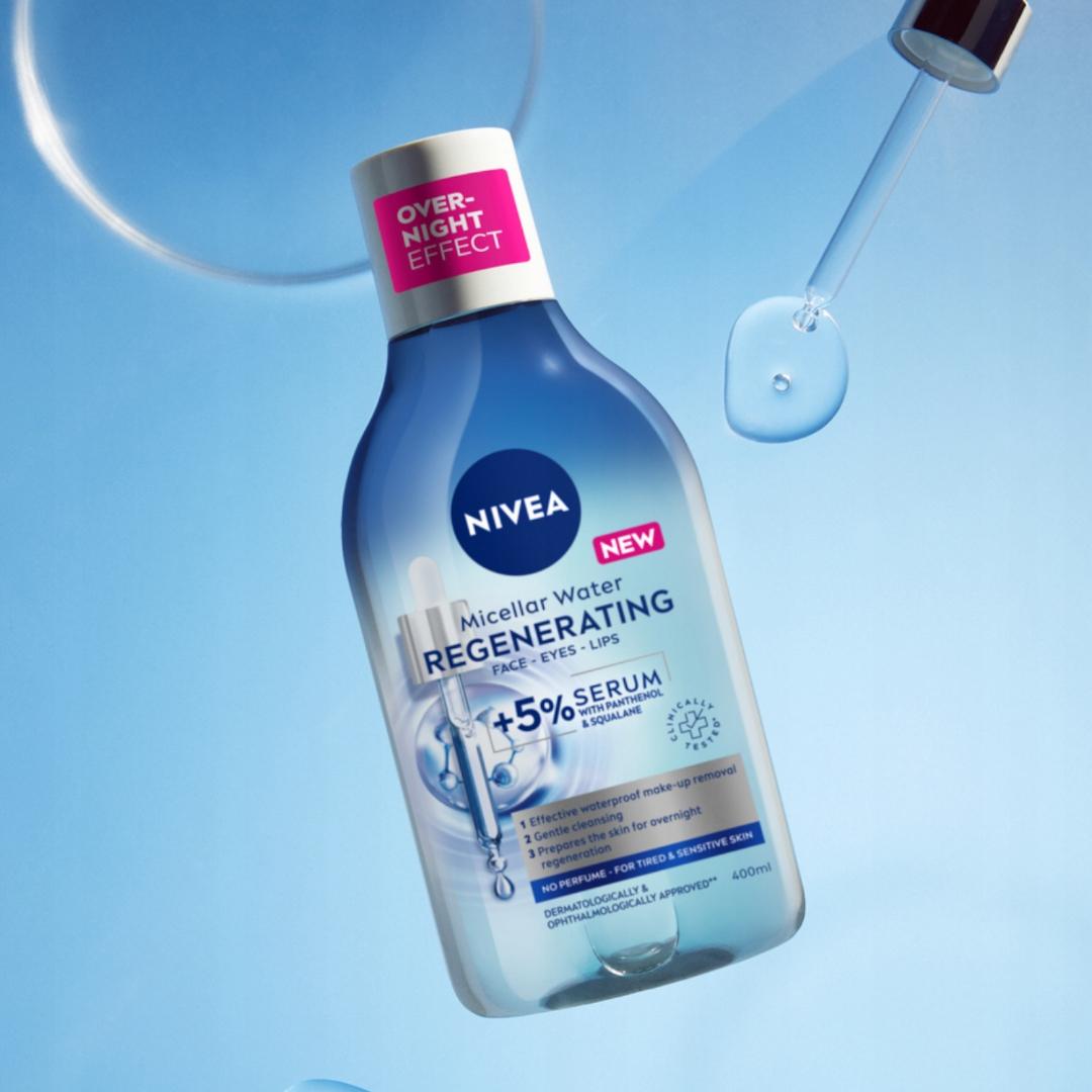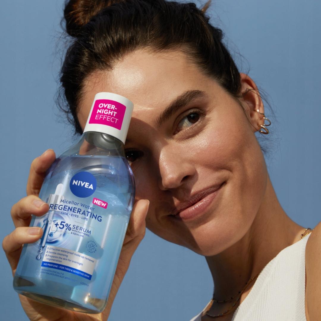 NIVEA Regenerujący płyn micelarny dla zmęczonej i wrażliwej skóry jest wzbogacony kompleksem aminokwasów i 5% serum z pantenolem i skwalanem. Usuwa wodoodporny makijaż, zanieczyszczenia i brud kilkoma lekkimi pociągnięciami, nie pozostawiając tłustych śladów. Nie wymaga pocierania, dzięki czemu bardzo delikatnie oczyszcza skórę. Przywraca nawilżenie i regeneruje, przygotowując skórę do nocnej regeneracji, aby następnego ranka skóra wyglądała na piękną i wypoczętą.