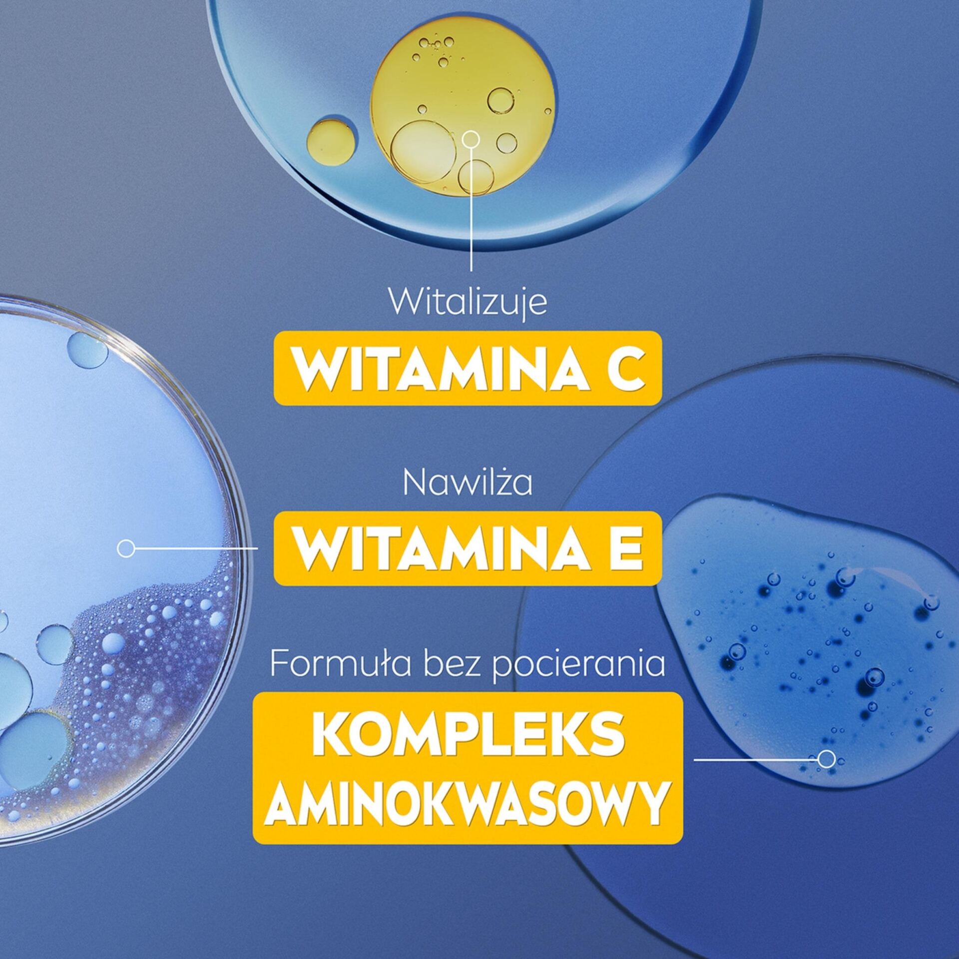 NIVEA Rozświetlający Płyn Micelarny do cery matowej i wrażliwej jest wzbogacony kompleksem aminokwasów i 5% serum z witaminami C i E. Usuwa wodoodporny makijaż, zanieczyszczenia i brud kilkoma lekkimi pociągnięciami, nie pozostawiając tłustych śladów. Nie wymaga pocierania, dzięki czemu bardzo delikatnie oczyszcza skórę. Rozjaśnia, energetyzuje i nawilża, zapewniając bardziej równomierną i gładką cerę.