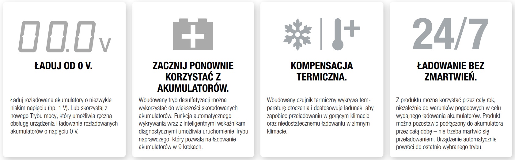 • W pełni automatyczna ładowarka i  urządzenie podtrzymujące ładowanie do codziennego użytkowania 24/7 bez zmartwienia o przeładowanie