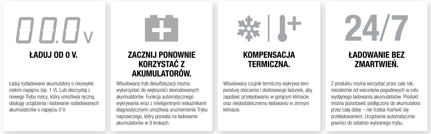 - W pełni automatyczna ładowarka i urządzenie podtrzymujące ładowanie do codziennego użytkowania 24/7 bez zmartwienia o przeładowanie