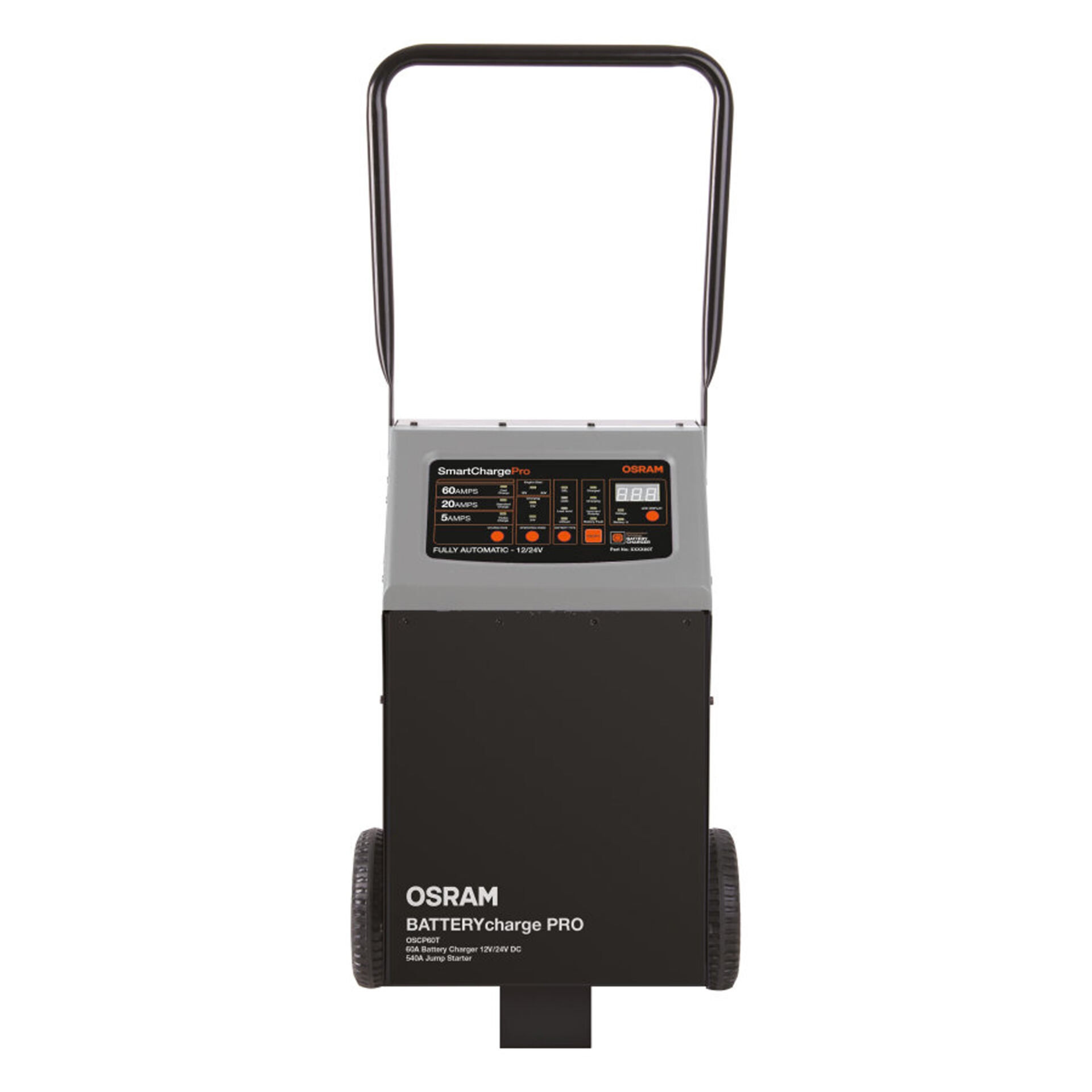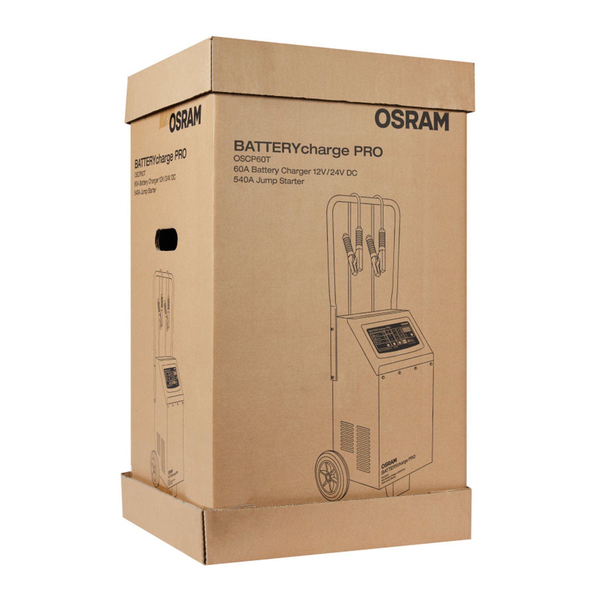 Oprócz funkcji ładowania akumulatora BATTERYcharge PRO 60A posiada zintegrowaną funkcję rozruchu awaryjnego. Profesjonalna ładowarka firmy OSRAM ze zintegrowanym ekranem LCD wykonuje 7-etapowy cykl ładowania dla akumulatorów litowych i 3-etapowy cykl ładowania dla wszystkich innych akumulatorów, aby przywrócić i zoptymalizować wydajność akumulatorów oraz poprawić utrzymanie ładunku. Wyposażona w uchwyt do wygodnego przenoszenia na górze urządzenia i kółka ułatwiające ciągnięcie lub pchanie, profesjonalna ładowarka firmy OSRAM jest łatwa do transportu po warsztacie.