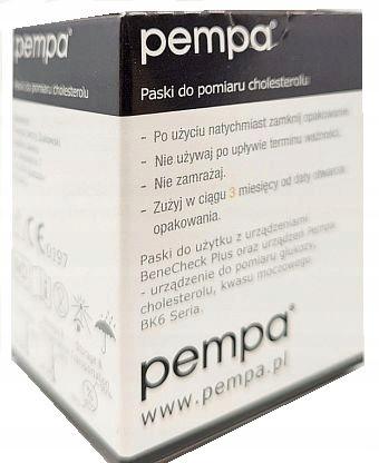 Paski s艂u偶膮ce do pomiaru poziomu cholesterolu we krwi. To obowi膮zkowe akcesorium potrzebne do wykonywania regularnych bada艅 i profilaktyki przy wyst臋powaniu nadmiaru z艂ego cholesterolu. Paski kompatybilne z wielofunkcyjnym urz膮dzeniem Pempa s艂u偶膮cym do pomiaru poziomu cholesterolu, glukozy oraz kwasu moczowego we krwi. Wynik otrzymasz ju偶 po 30 sekundach od aplikacji.