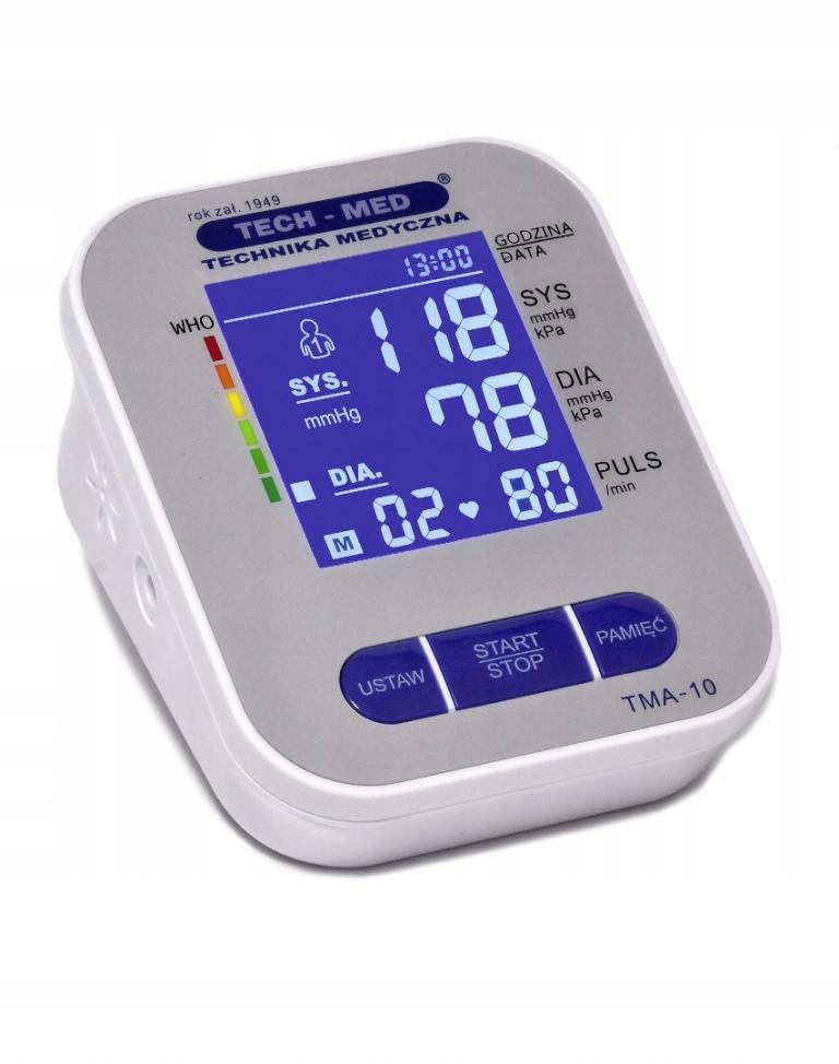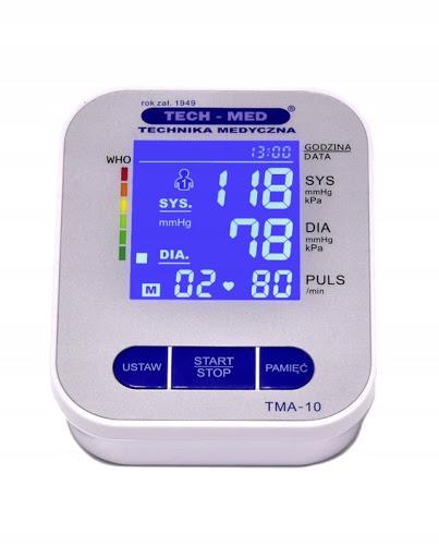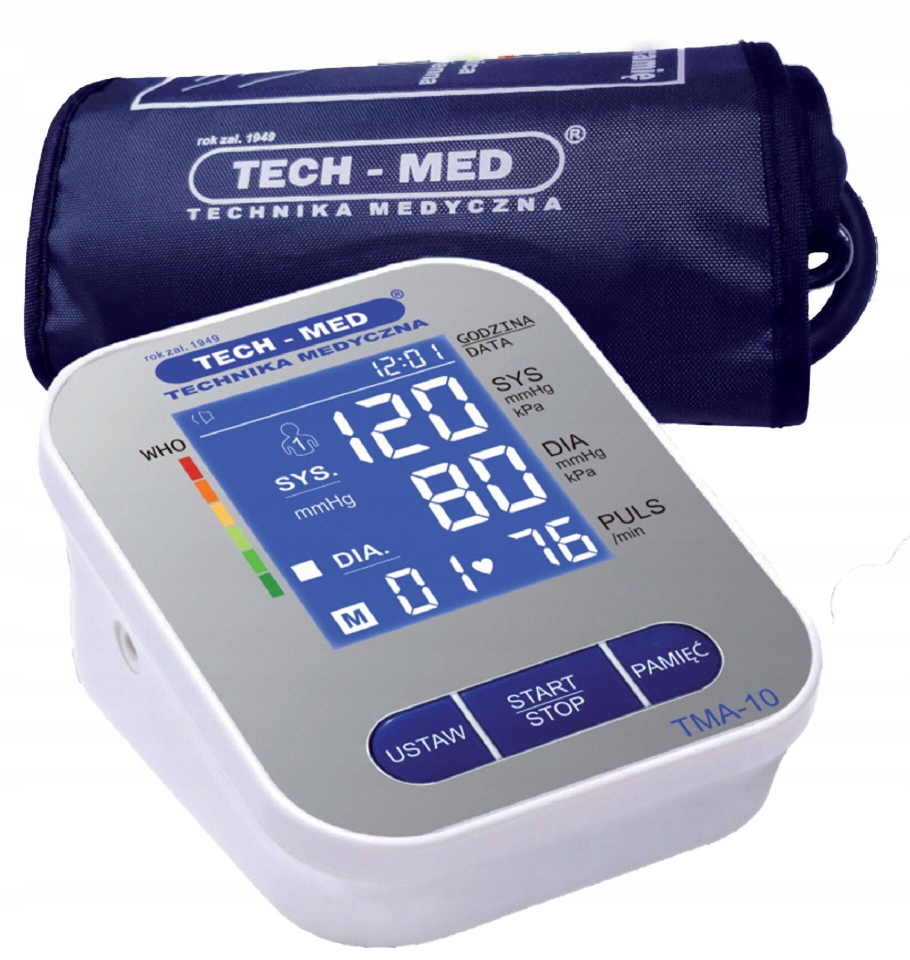 Ciśnieniomierz TMA-10 TECH-MED jest nowoczesnym, w pełni automatycznym, cyfrowym urządzeniem o zaawansowanej technologii. Naciśnięcie przycisku po założeniu mankietu powoduje, że aparat mierzy ciśnienie krwi oraz tętno i wyświetla wyniki na wyświetlaczu cyfrowym.